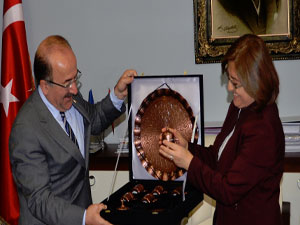 Ziyaretin anısına Başkan Gümrükçüoğlu Bakan Şahine kahve takımı, Bakan Erdoğan’a da telkâri tespih hediye etti.