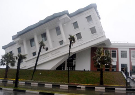 Görenleri şaşırtan binanın çatısı zeminde yer alırken, restoranın tavanına ters olarak monte edilen masa, sandalye, saksı, lavabo ve merdivenler büyük ilgi çekiyor.