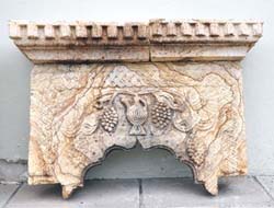 19. yüzyıldaki taş oyma sanatının nadir örneklerinden biri olan tarihi şömine taşı, 54 santimetre yüksekliğinde ve 85 santimetre genişliğinde. Şömine taşının üzerinde 4 adet üzüm salkımı ve bir adet ibrik bezemesi yer alıyor. Alt kısmı kemer şeklinde oyulmuş olan şöminenin alınlık kısmında, üst kısmı yarım daire biçiminde 4,5 santimetre uzunluğunda kabartmalar yer alıyor. Şömine taşı üzerinde yer alan üzüm salkımı kabartmasının zenginliği ve bereketi, ibrik motifi ise eşya sahibinin Müslüman olduğunu simgeliyor