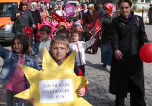 Minikler yürüyüş boyunca ellerinde silaha hayır, silahı bırak oyuncağı al, şiddet unsuru olan silahtan uzaklaşalım pankartları ile silaha hayır sloganı attılar.