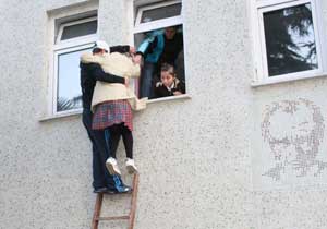 Trabzon Atatürk İlköğretim Okulu'nda bugün ilginç bir olay yaşandı. Öğle saatlerine kadar eğitim-öğretim faaliyetlerinin yapıldığı okulda, öğleden sonra başlayan Kurban Bayramı tatili nedeniyle okul kapatıldı. Öğrenciler okulu boşalttıktan sonra idareciler de kapıları kilitleyerek okuldan ayrıldı. Bu sırada okulda unutulan 8-B sınıfı öğrencileri Gökçe Yeşilaral ve Züleyha Aykut isimli öğrenciler pencereye çıkarak okul bahçesinde futbol oynayan gençlerden okulda kilitli kaldıklarını belirterek yardım