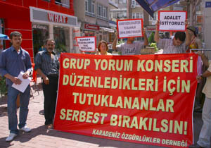 Süleymaniye Geçidi'nde yapılan eylemde grup adına açıklamada bulunan Dernek Basın Sözcüsü Tarık Akbaba Akbaba, Trabzon'da 11 Nisan 2009 tarihinde ve Samsun'da 15 Mayıs 2009 tarihinde Karadeniz Özgürlükçüler Derneği üyesi 14 kişinin Grup Yorum konserini düzenledikleri için tutuklandıklarını, konser düzenlemenin suç olmadığını ve arkadaşlarının serbest bırakılmalarını istediklerini söyledi.