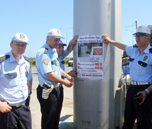 Can ve mal güvenliği yönünden mağduriyetlerin yaşanmaması için farklı kampanyalar yaparak sürücülerimizi bilinçlendirmeye çalışıyoruz. Bugünkü uygulamamızda afiş ve broşürlerle bilgilendirme ve bilinçlendirmeyi amaçlıyoruz. Bu çalışma için 500 adet afiş bastırıp bunları öncelikle, petrol istasyonları, galeriler, banka ve yol kenarında bulunan iş yerlerine asılarak hız sınırları ile ilgili sürücüleri bilgilendiriyoruz” dedi-.