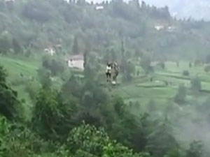 Rize’nin bir köyünde çekilen görüntüde, iki kişinin korkusuzca yerden 100 metre yükseklikten teleferikle bir uçtan bir uca gittikleri görülüyor.