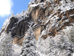 Kar yağışı bu sabahtan itibaren yerini güneşe bırakırken, ortaya da seyrine doyum olmaz manzaralar çıktı. Trabzon'un Maçka sınırları içindeki Altındere Milli Parkı'nda bulunan Sumela Manastırı, etrafındaki çam ormanlarıyla muhteşem bir güzellik sergiledi.
