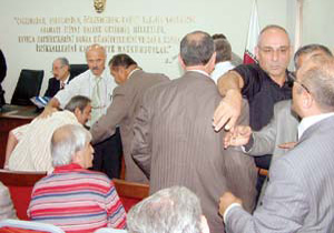 Akçaabat Esnaf Odası Başkanı Yaşar Sivrikaya ise, Yılmaz kürsüden inerken, "Ramazan ayındayız, böyle seviyesiz konuşulmaz. O kürsüyü de mikrofonu da kırarım" deyince ortam daha da gerginleşti. Sivrikaya'nın üzerine yürüyen Yılmaz, "Sen kürsü kırarsın ben adamın kafasını kırarım" şeklinde konuştu. Her iki oda başkanını diğer oda başkanları yatıştırdı.
