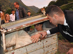 Otomobille Üzümözü köyüne ulaşan Kara çifti, yaşayacakları Karaışık Mahallesi'ndeki evlerine ulaşmak için yol olmayınca, ilkel teleferiği kullanmak zorunda kaldı.
