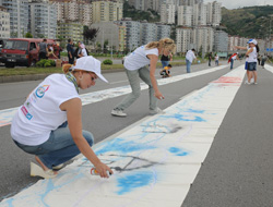 Resim çalışmasının değişik kesimlerine 23-30 Temmuz 2011 tarihleri arasında Trabzon’da yapılacak 11. Avrupa Gençlik Olimpik Oyunları’yla ilgili sloganlar değişik renklerde işlendi.