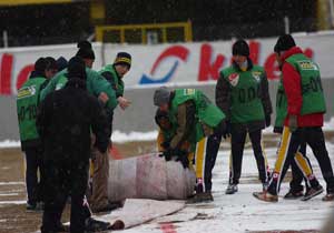 Trabzonspor Ankara deplasmanında. Bugün 15.00'da başlayacak olan Ankaragücü-Trabzonspor maçı yağan kar yağışından dolayı sahanın çimi temizleniyor. Hakem Bülent Çakır, tarafından saha kontrol edilerek, yağan kardan dolayı saha çizgilerinin tekrar çiziliyor.