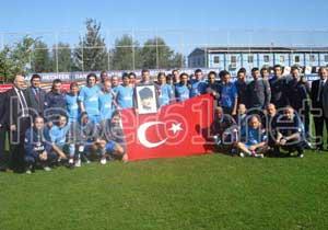 Antrenman öncesi bordo-mavili futbolcular, yönetim kurulu üyeleri ve teknik heyet, Cumhuriyet Bayramı'nı Türk bayrağı açarak kutladılar.