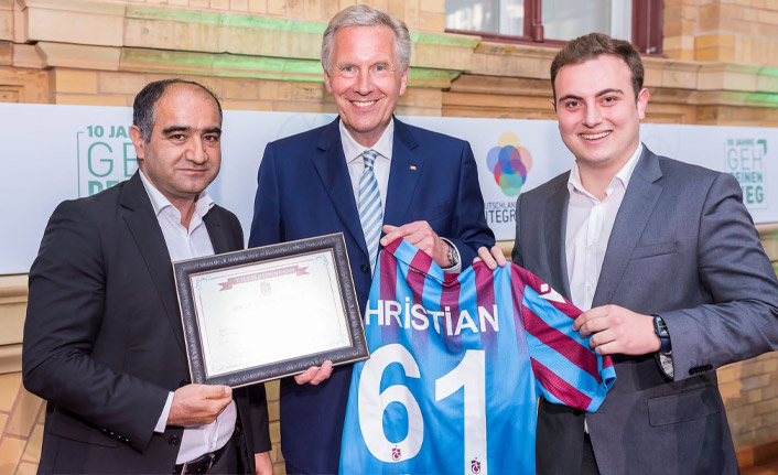 Haber61 - Spor Servisi / Geçtiğimiz günlerde Berlin’de Almanya Başbakanı Olaf Schoz’un da katılımıyla gerçekleşen panelde 18.Dönem Almanya Milletvekili Özcan Mutlu ve CDU parti üyesi aynı zamanda Trabzonspor üyesi Efe Karanis önceki dönem Almanya Cumhurbaşkanı Sayın Wulf’a Trabzonspor onur üyeliği belgesini ve Trabzonspor formasını taktim ettiler.
