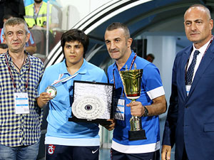Hüseyin Avni Aker Stadyumu’nda oynanan Galatasaray derbisi öncesinde gerçekleştirilen törende, şampiyon sporcuya plaket verildi. Busenaz Sürmeneli’ye plaketini Trabzonspor Başkan Yardımcısı Ali Uzunay takdim ederek başarılarının devamını diledi.